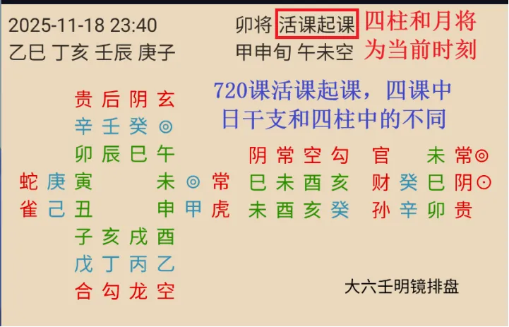 盘面显示起课方式为:活课起课。次数的四柱和月将为当前时刻的真是四柱和月将。四课中的日干支和四柱中的日干支不一致,采用的是720课中的日干支。