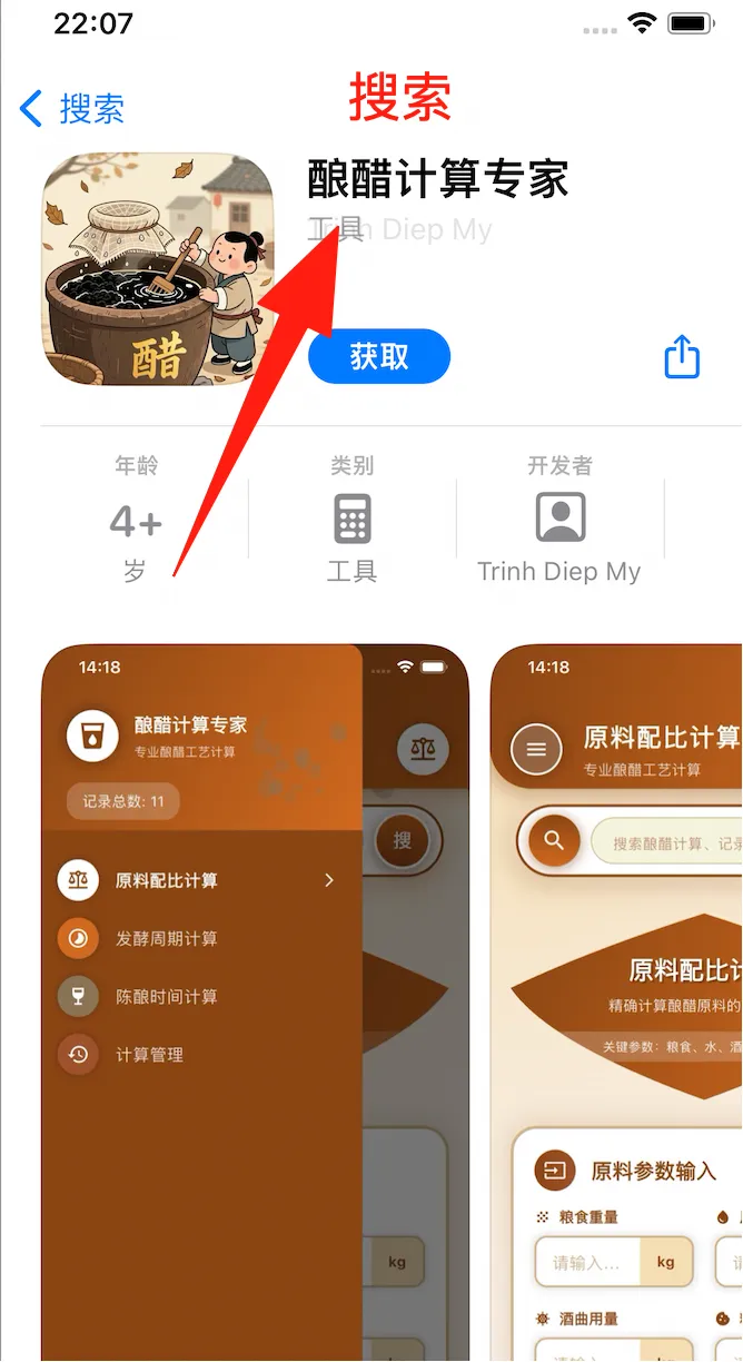 在苹果手机app store搜索“酿醋计算专家”,然后依照下面图片点开。