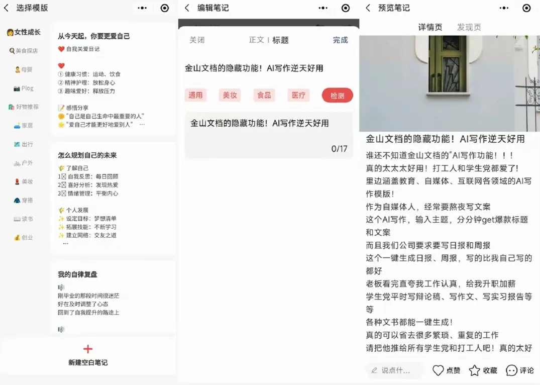 它连平台自己划定的隐蔽敏感词都能检查出来另外,它还能让我们提前预览笔记发布后的效果。