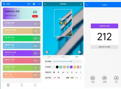 它支持倒数日个性化设置,包括:背景音乐、背景图片、图片模糊、字体样式、炫彩字体、边框样式。