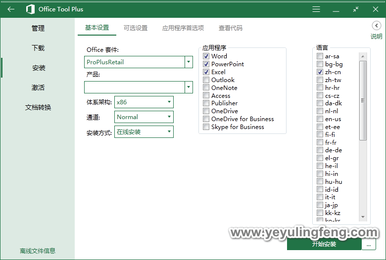 Office Tool Plus是一款功能非常强大的万能office管理工具,可以随意的配置你的office安装,想装什么就装什么,非常的方便,并且软件除了配置office之外,软件还拥有卸载、下载、安装、激活等office管理功能,相当的便捷,让你使用起office来不再感觉到丝毫的麻烦和不快,适合所有使用office的用户下载。站内提供的office 2016有好几个版本,由于系统版本有差异老夜在这里也不能百分百保证兼容所有的电脑,经常有一些网站用户因为安装office失败向老夜反馈,再加上一些小白用户对于office繁琐的安装步骤云里雾里,索性给大家分享一个一键傻瓜式的office安装工具,能够根据系统位数以及需要的应用版本自动下载和安装,还把激活也一条龙搞定了,特别适合不愿意折腾的小白使用。