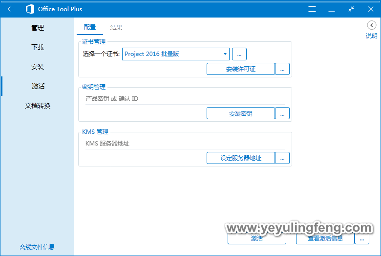 4、激活 Office。Office Tool Plus 可以安装/卸载密钥、转换 Office 授权版本、配置 KMS 服务器地址、清除激活信息或者是证书、查询当前 Office 的激活信息。无论是联网激活、电话激活还是 KMS 激活, Office Tool Plus 都可以轻松应付。(PS:Office Tool Plus不存在破解行为,只有配置 KMS 的功能)