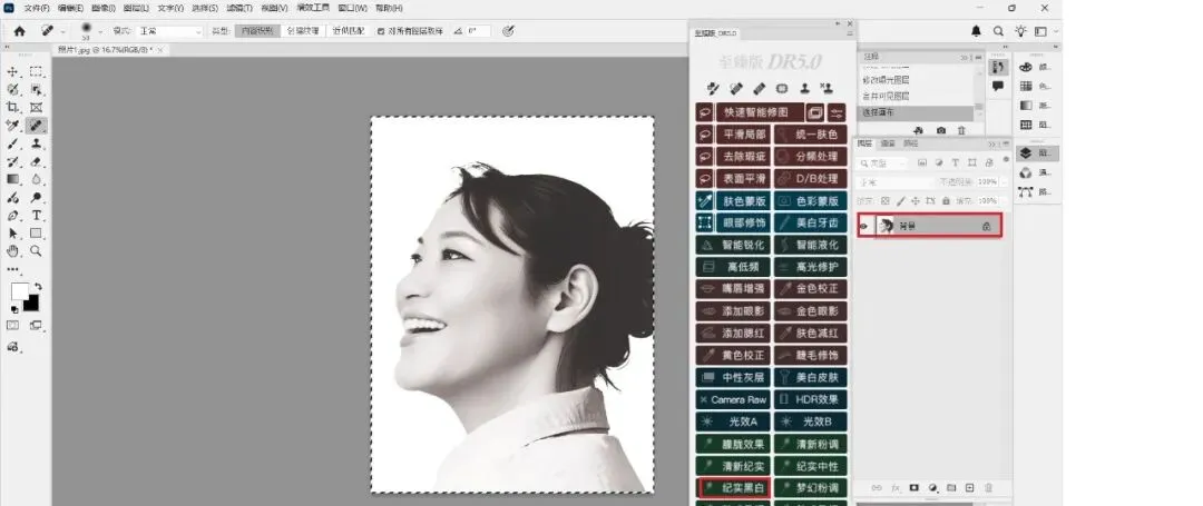 3、鼠标左键单击“至臻版DR5.0”,打开“至臻版DR5.0”编辑面板,鼠标左键单击“纪实黑白”,效果合并到“背景图层”。如:图3。