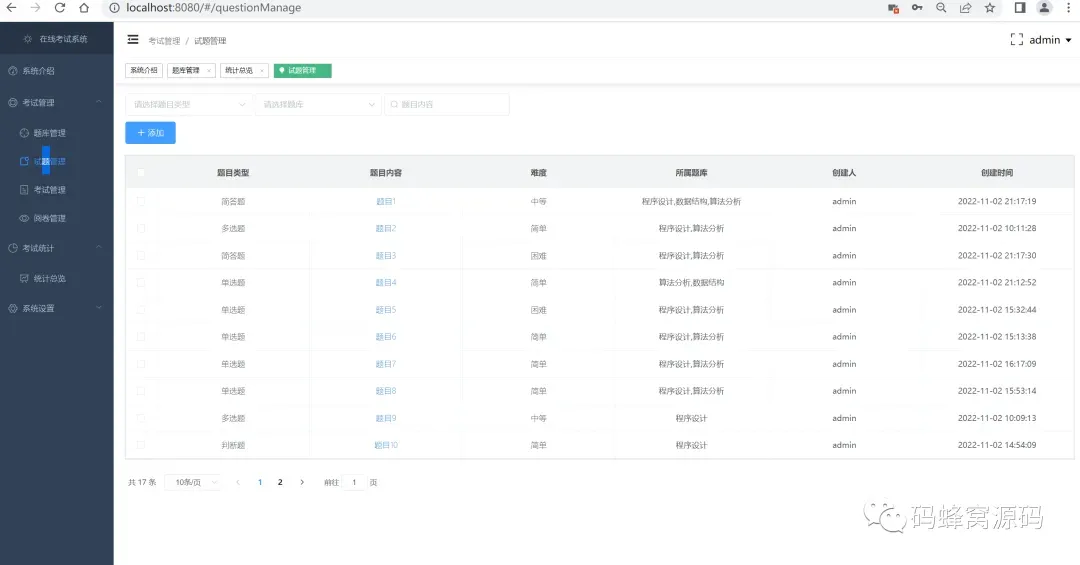 管理员和教师登录系统后,可以查询所有题库,并且增加题库,选择题型,难度,试题解析等。