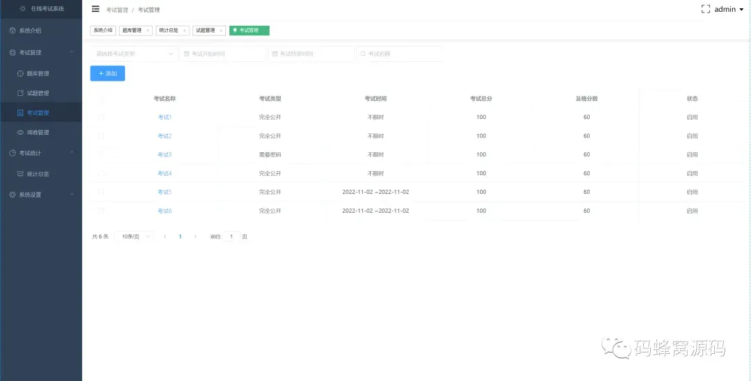 管理员和教师登录系统后点击考试管理模块可以对所有考试进行查询,并且进行添加考试,添加考试可以通过添加试卷名称,试卷介绍,所属学院,所属专业,年级,考试日期,持续时间,总分,考试类型,考生提示等信息。