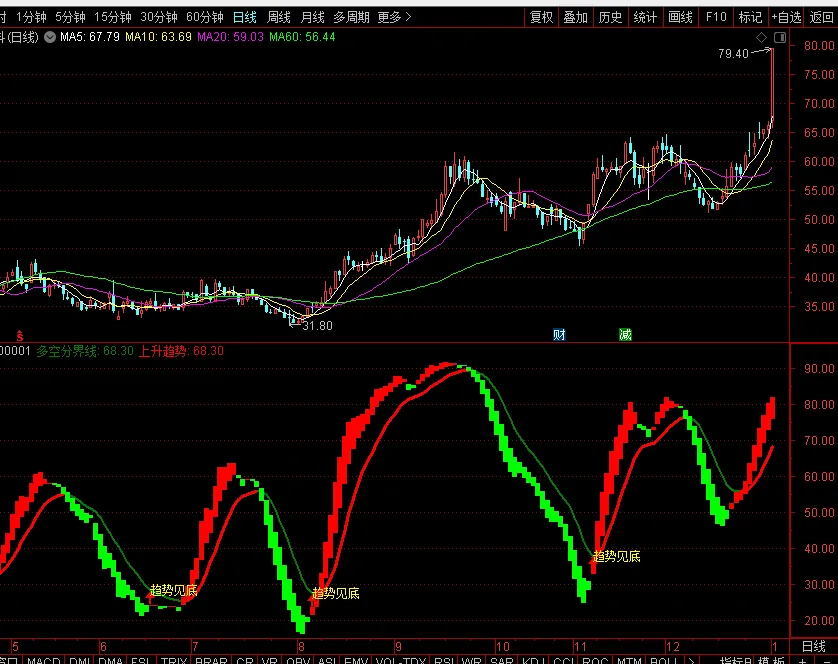 上升趋势:IF(多空分界线>=REF(多空分界线,1),多空分界线,DRAWNULL),COLORRED,LINETHICK3;