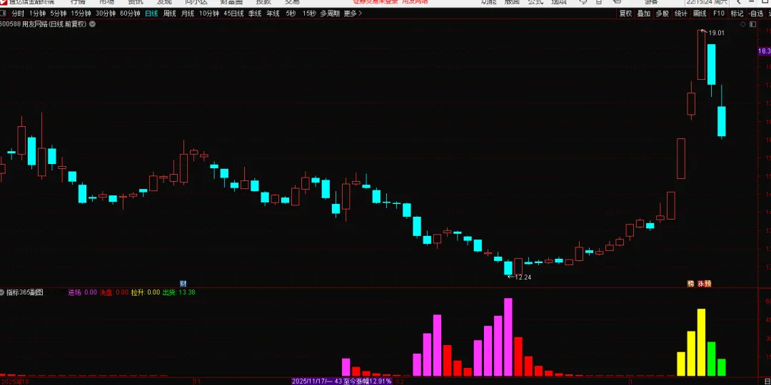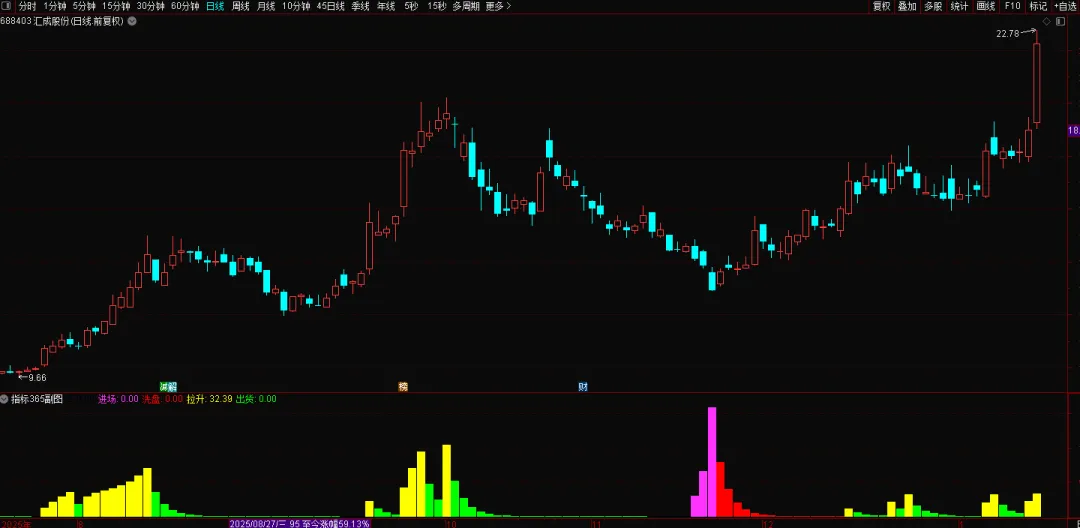 拉升:IF(VAR51>REF(VAR51,1),VAR51,0),COLORYELLOW,NODRAW;{拉升信号:当VAR51环比上涨时,显示VAR51的值,否则为0(黄色,不绘制数字)}
