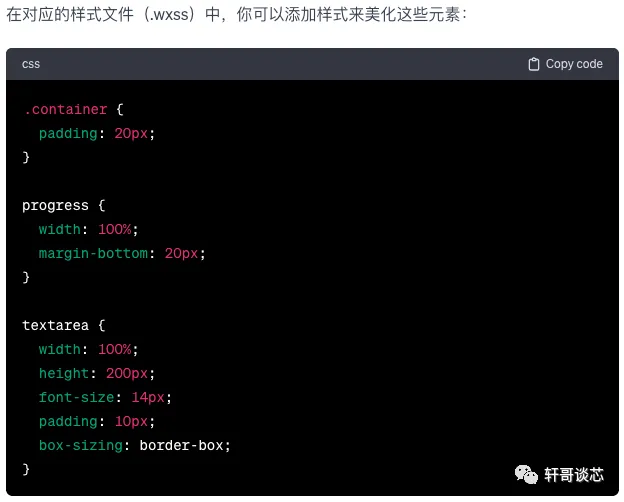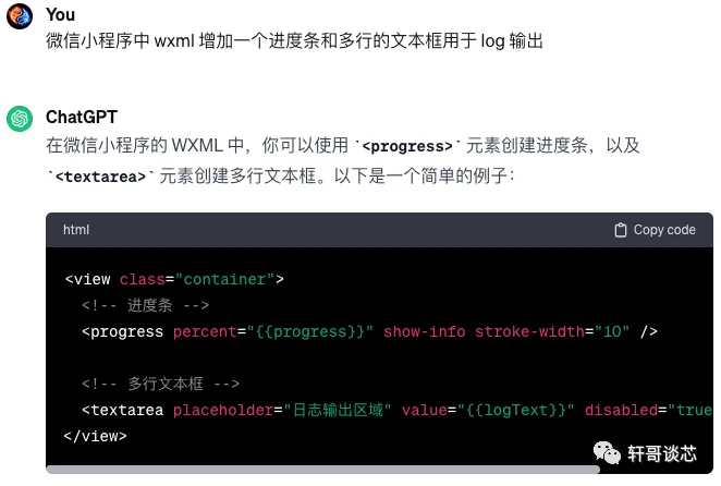 如今在小程序中不知道多了多少特性,同时还有未知的XML和CSS等UI相关的语法需要了解,实际是一直驻足不敢往前迈步的,终于让我想到了chatGPT,这下可以大步往前迈进了。