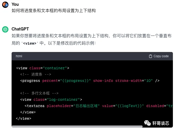 // 从数组 buff 中截取一部分形成一个新的数组voidextractSubarray(int* buff, int startIdx, int length, int* frame){for (int i = 0; i < length; ++i){frame[i] = buff[startIdx + i];}}chatGPT 会提供给我们两种方法,并用示例的方式给出调用,最后还会附上解释,相当的专业。 面对高级语言中的千变万化的新特性,我再也不需要去啃 API 文档,也不需要去什么 MSDN 上去查资料了, 这是 chatGPT 给我的第一个助力,他让我不再畏惧任何新语言的基础学习。 再比如,我开发小程序的时候,界面的搭建非常苦恼,百度或者谷歌搜起来其实挺费精力的,往往一篇文章还需要看完后在进行分析哪些是自己要用的,哪些是对当前问题没有意义的干扰信息,而有了 chatGPT,这些问题都迎刃而解。 我对于 XML 语言是没有基础的,我的初始页面是这样子: 我想在这个下面增加一个按键和进度条,以及一个 log 输出的窗口用于做一下数据 download 功能,于是我直接问 chat GPT: 最后我根据 ChatGPT 的代码实现了如下图的效果,ChatGPT 简直就像一个老师一样,为我们考虑的很周全,每一个问题他都会给出示例,并且解释原理,这样在一个项目的开发过程中就可以现学一门语言,虽说到不了精通,至少解决问题是绝对能够胜任的。 二 算法实现