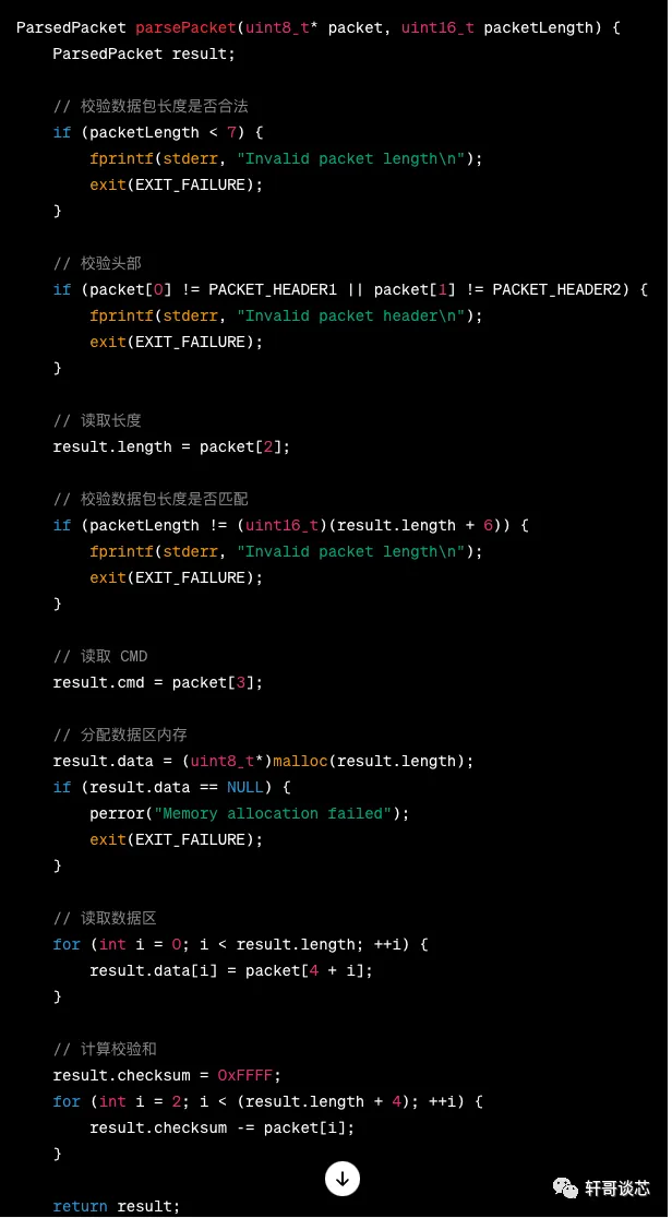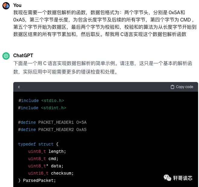 上面讲的都是问ChatGPT 的一些编程的基础问题,或者说这些都是可以从资料中可以查询到的,接下来我们就迈入了 ChatGPT 智能的领域了。 首先我想实现一个串口的数据包解析。 三 语言的转换
