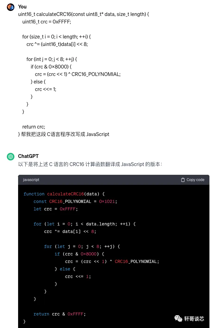 下面我们来看看更好的用法,这就类似于 AI绘画中的垫图的思想,我虽然 JavaScript 语法忘记了,能力很菜,但是我C语言很熟练,我可以先把 C语言的程序写好,然后让 ChatGPT 给我翻译成 JavaScript,最后我只需要复制粘贴就大功告成了。 我用 C语言实现了一个 CRC16 的校验和计算程序,我需要移植到 JavaScript 上面: uint16_tcalculateCRC16(constuint8_t* data, size_t length){uint16_t crc = 0xFFFF;for (size_t i = 0; i < length; ++i){crc ^= (uint16_t)data[i] << 8;for (int j = 0; j < 8; ++j){if (crc & 0x8000){crc = (crc << 1) ^ CRC16_POLYNOMIAL;}else{crc <<= 1;}}}return crc;}现在我就给 ChatGPT 发命令了: 用这种“垫”程序的方法,我们只需要精通一门语言,就可以通过 ChatGPT 在瞬间触类旁通了,以后再也不会因为多学一门语言而犯愁了。 四、借助GPT从零开发一个软件的功能模块