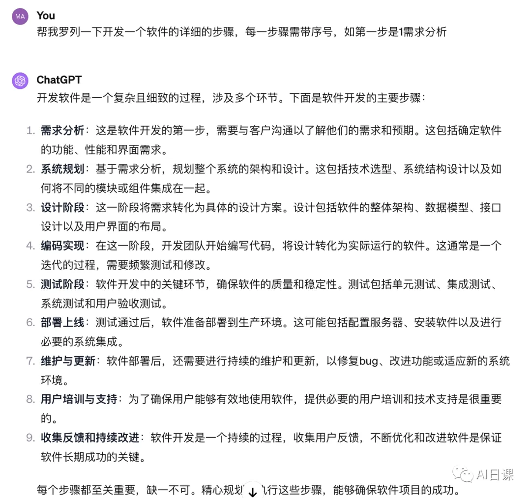 首先,我们问一下GPT,软件开发的整体流程