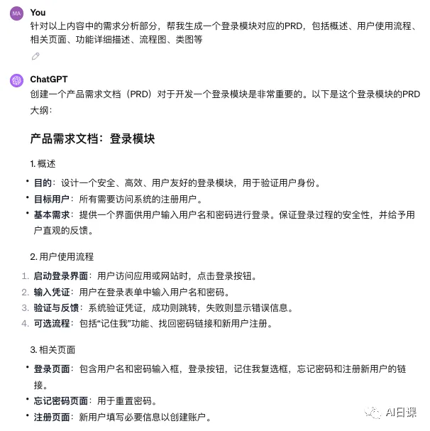 做完初步需求分析后,我们尝试让ChatGPT生成用户故事,进一步分解任务的细节: