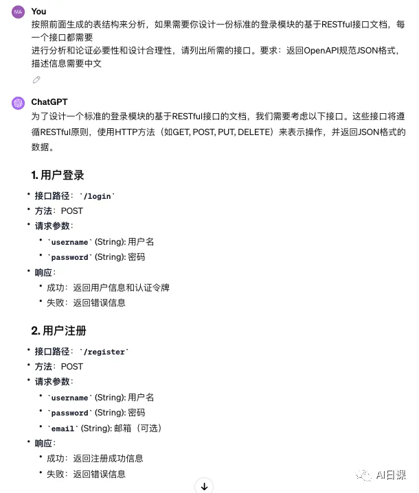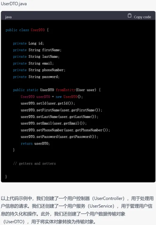 任务细化后,GPT-3.5就用户模块的内容生成了具体代码,并且按照文件和架构拆分为了controller、service、dao三部分,符合Spring框架的开发习惯,几乎是拿来即用的。