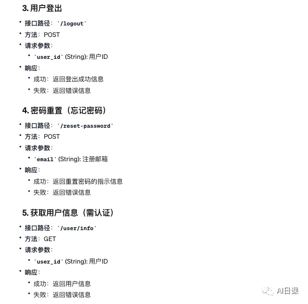 以下是这些接口的OpenAPI规范JSON格式的一个示例概要:{"openapi": "3.0.0","info": {"title": "登录模块API","description": "为登录模块提供的RESTful API接口。","version": "1.0.0"},"paths": {"/login": {"post": {"summary": "用户登录","description": "用户使用用户名和密码进行登录。","requestBody": {"required": true,"content": {"application/json": {"schema": {"type": "object","properties": {"username": {"type": "string"},"password": {"type": "string"}}}}}},"responses": {"200": {"description": "登录成功"},"401": {"description": "认证失败"}}}},"/register": {"post": {"summary": "用户注册","description": "新用户注册。","requestBody": {"required": true,"content": {"application/json": {"schema": {"type": "object","properties": {"username": {"type": "string"},"password": {"type": "string"},"email": {"type": "string"}}}}}},"responses": {"200": {"description": "注册成功"},"400": {"description": "请求参数错误"}}}},// 其他接口的定义类似}}