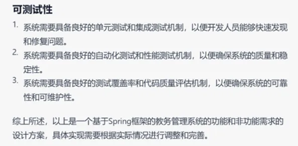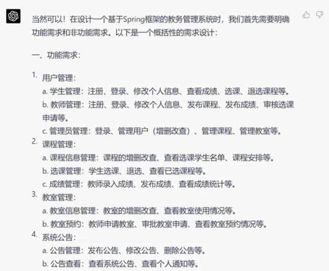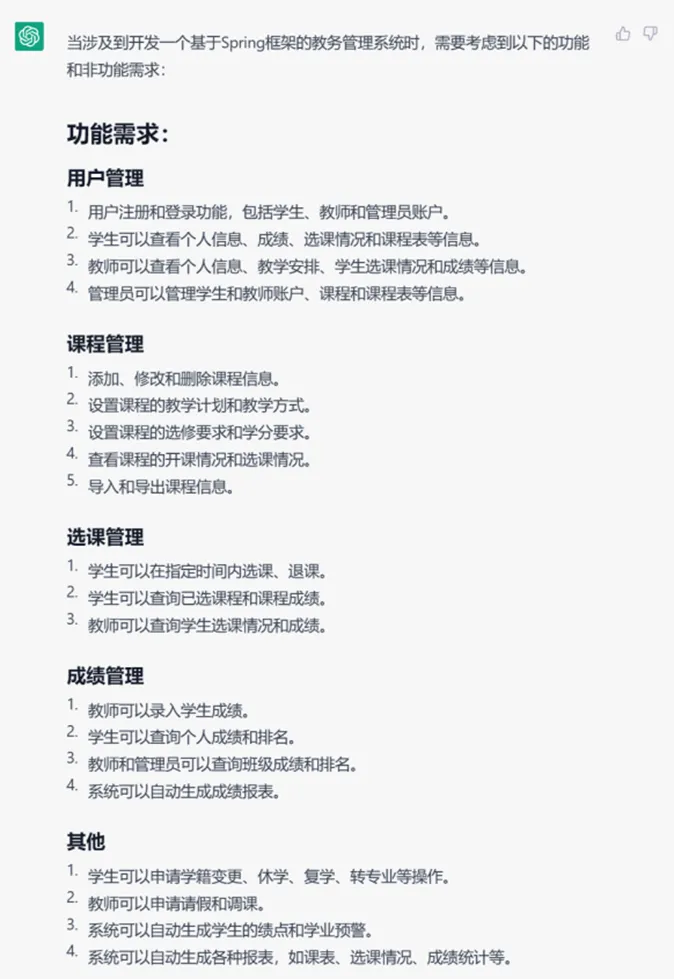 在非功能性需求上看,GPT-4的结果涉及的内容更加丰富,但缺点是内容与教务系统场景结合并不紧密,反而是GPT-3.5考虑到了实际的业务场景。例如关于高并发,GPT-3.5提到“能够在繁忙的选课期间保持稳定的性能”,而GPT-4只是笼统地说“系统应能在高并发场景下正常运行”。