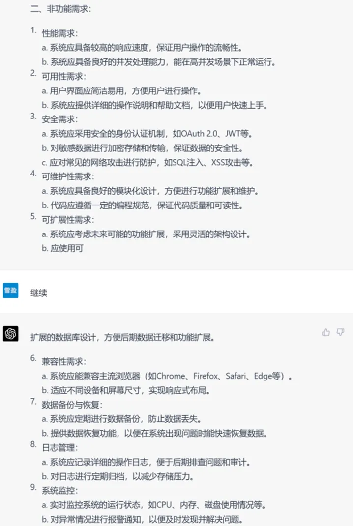 第一部分,我们模拟一个从零开始的开发场景,开发者只有一个关于目标系统的基础概念,将需求分析和细化工作全部交给ChatGPT生成。为了结果尽可能细致,我们在prompt时加入了功能和非功能性需求的拆分。