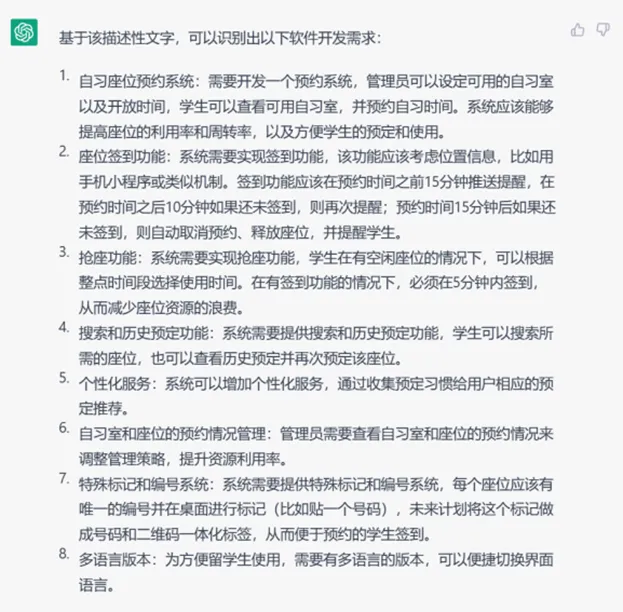从结果观察,GPT-4生成的条目更多,对有些需求进行了更细粒度地拆分,对于相同需求的描述也显得更为简单。例如GPT-3.5回复的第二条座位签到功能,在GPT-4生成的结果中被细分为了4、5、6三条。