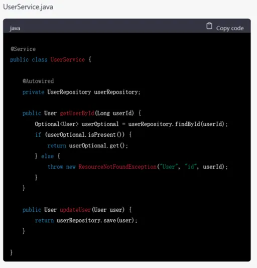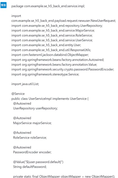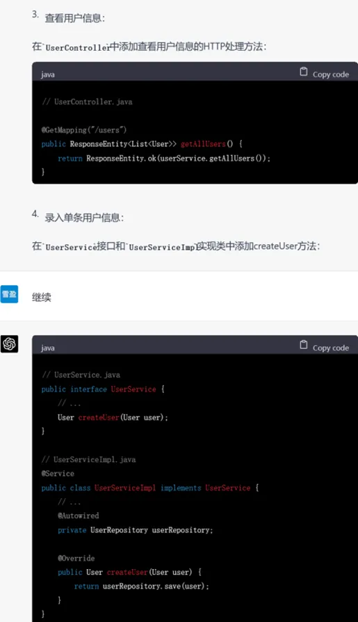 GPT-4不仅进行了完成了从需求分析、设计、实体抽取到代码框架的编写,而且以用户模块为例,展示了controller层和service层的具体写法,相较于GPT-3.5,还考虑到了service层的接口和实现,内容非常细致。以它呈现的大体框架为出发点,还可以针对相应的部分进行进一步的代码生成,逐渐形成系统级别的代码。