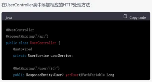 首先观察Controller中的代码,在此过程中,我误将其中的ResponseEntity认为是一个自定义的实体类,故而在此我要求其生成一个ResponseEntity实体类。但ChatGPT没有受到我的“误导”,而是纠正了我的错误,同时解释了该实体类该如何使用。