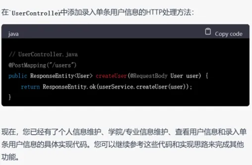 这里值得注意的是,在进行进一步提问以获取更加详细的功能代码时,需求描述应尽量清晰。例如即便第一轮提问已经涉及了全部功能,但要求ChatGPT实现具体功能代码时,列出需要实现的具体功能名称(例如提问”能否给出个人信息维护、学院/专业信息维护的具体实现代码“)比简单使用代词(例如提问”能否给出上述功能的具体实现代码“)的效果要更好。
