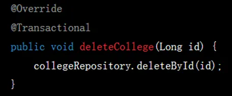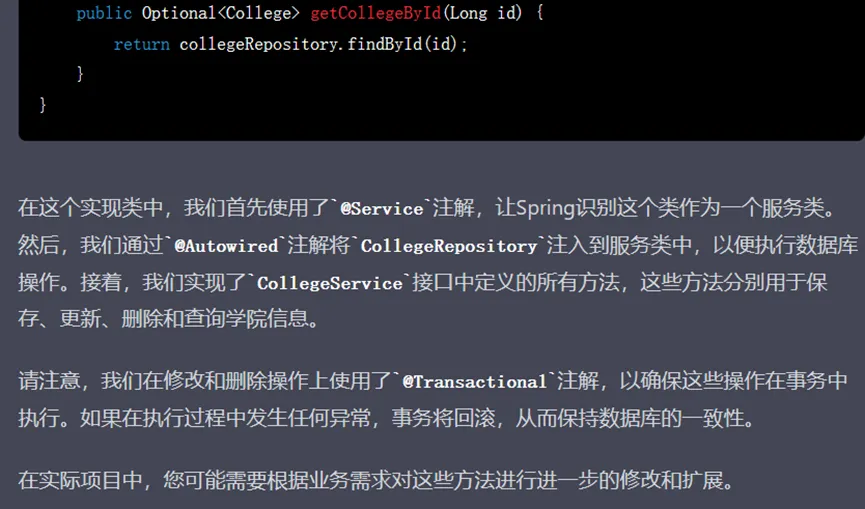 所以deleteCollege方法应当返回一个布尔值,但其生成的代码却不返回值,看起来就像ChatGPT“不记得”之前写过的代码,没有做到前后对应: