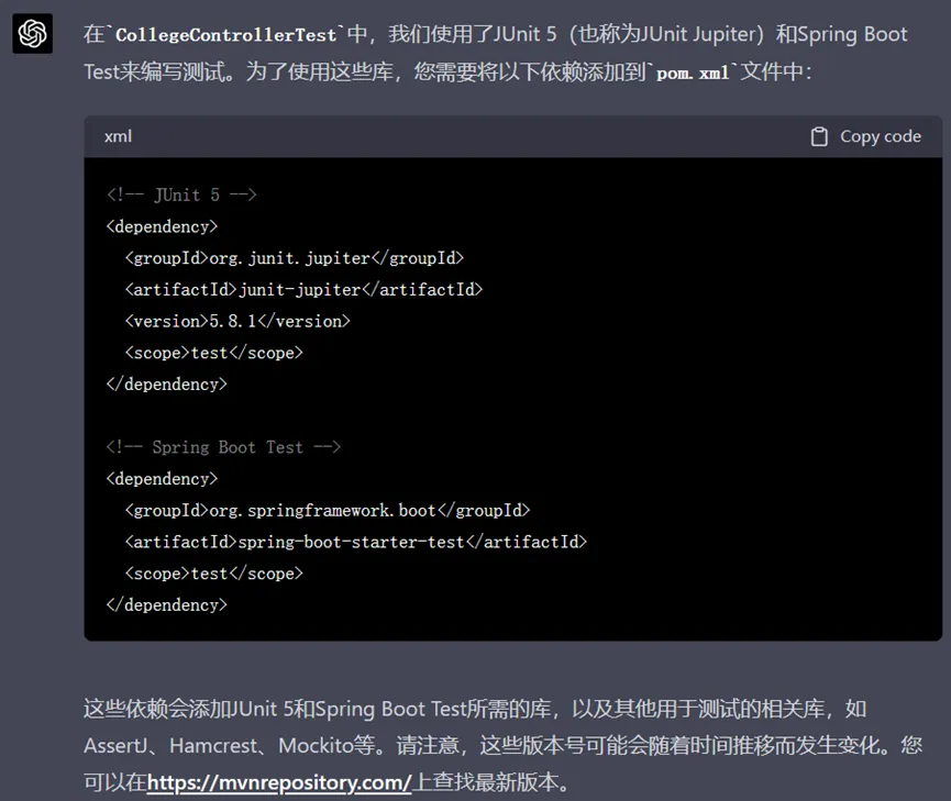 但是ChatGPT生成的测试代码中使用的是像@RunWith这样的JUnit4中的注解,而它却让我们添加的却是JUnit5的依赖,经过提醒后它对结果进行了修正: