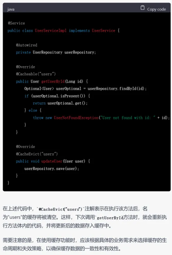在理论性的知识上,双方都可以出了很多可行的措施,相较之下,GPT-4给出的建议更丰富、更具统领性。针对双方建议中都提及的缓存,我们要求给出具体的代码: