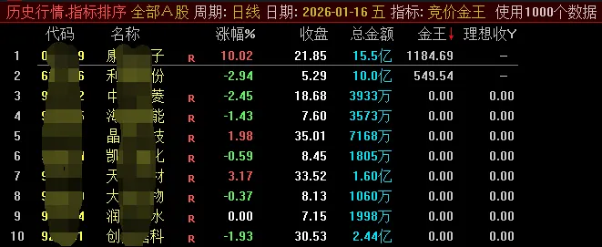 ②交易日9:25后-9:30之前,快捷键 .401排序,更改排序指标“金王竞价”指标,“金王”值由大而小排序,优先选择分数高的;
