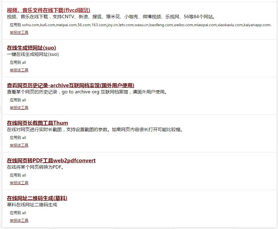 有且不限于:百度文库免费下载、百度网盘不限速下载、音乐视频在线下载、音乐免费下载、短链接生成、网页长截图、网站二维码生成……