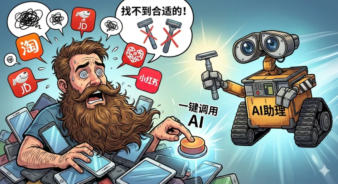 就在昨天,我自己也遇到了一个很具体的例子。因为惯用的刮胡刀老化,我已经好几周没能好好修胡子。事情又多得要命,但我还是不得不挤出将近一个小时,在京东、拼多多、小红书、淘宝之间来回切换,看参数、翻评论、对比推荐,最后依然没找到真正合适的那一款。那一刻我心里非常清楚,我需要的并不是“更多 App”,而是有人,或者一个 AI,能替我把这件事彻底搞定,把时间还给我真正想做的事情。