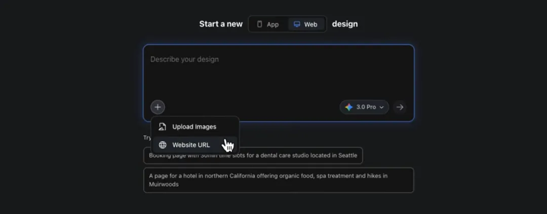 这个功能呢可以参考截图或者是网址来生成风格相似的UI设计,也就是类似复刻网站的这样一个功能。