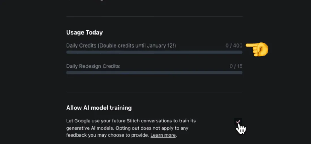 每天400个普通积分,可以用来根据文本去生成UI设计。还有下面是15个redesign积分,可以用来参考截图或者是网址来生成一个相似的UI设计。