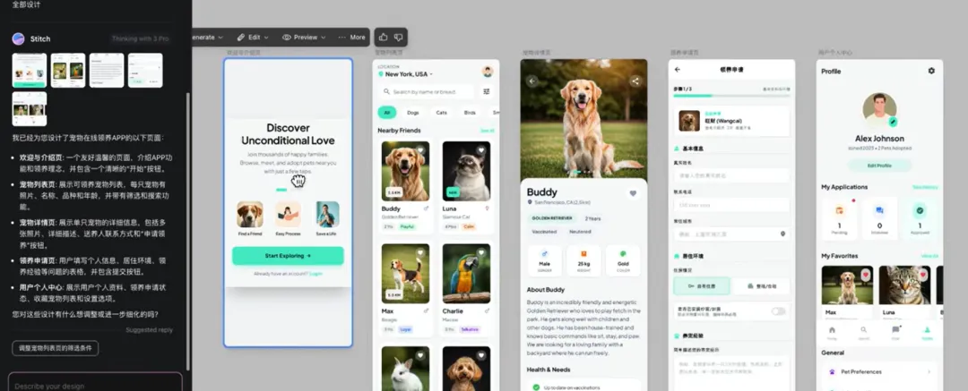 Stitch生成的结果。除了这个UI设计图,还包括它对应的前端代码。