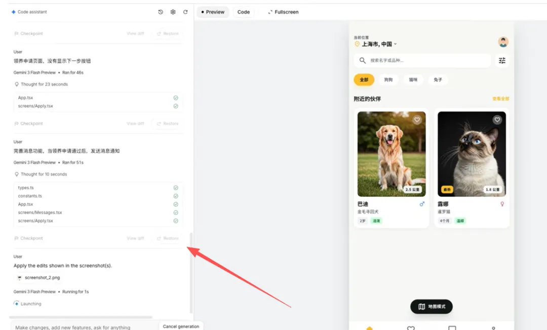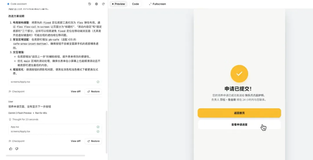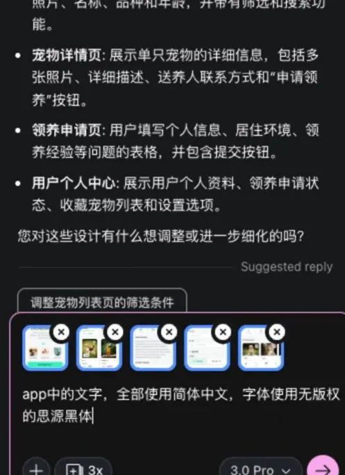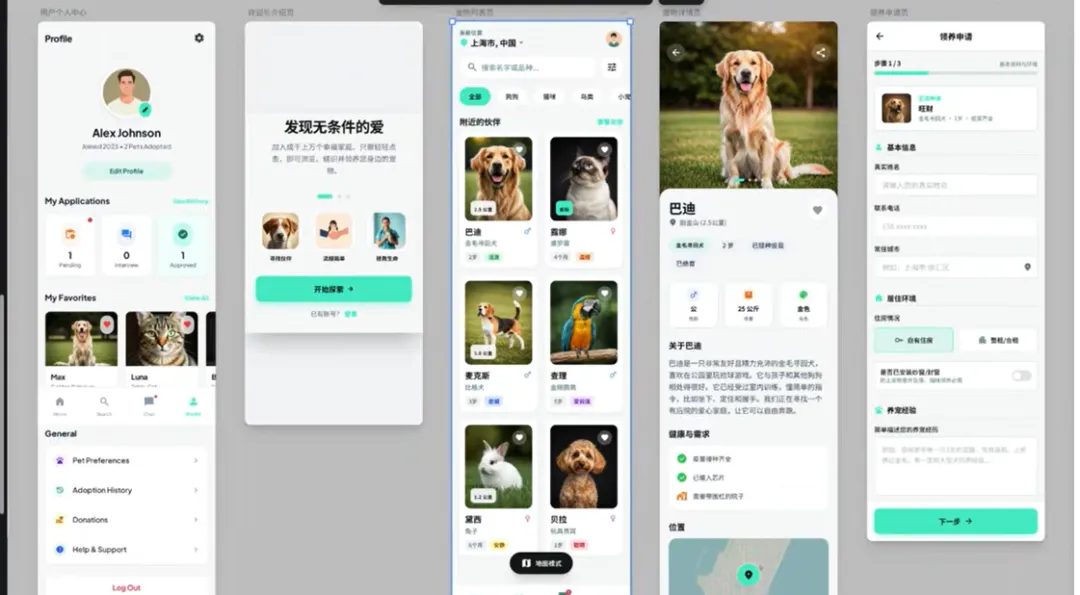 执行结束以后我们来看一下这个胜出的app那这些可以看到点击都是有响应的,还有这个领养申请的页面。那在测试中如果发现问题,可以让艾斯studio继续修改。