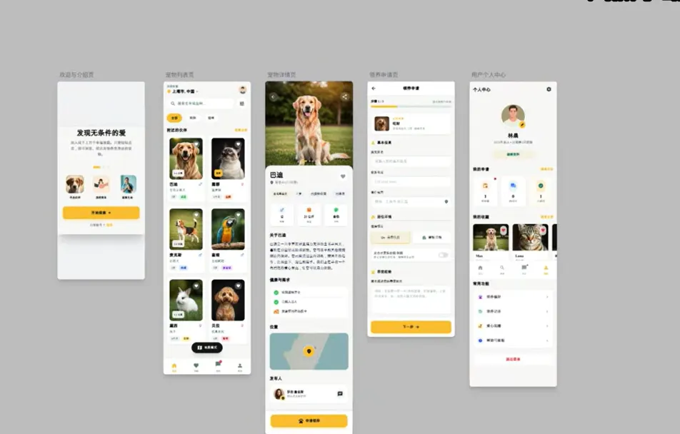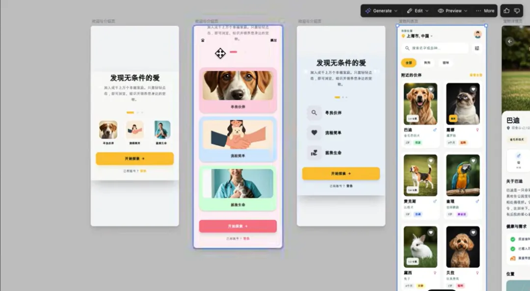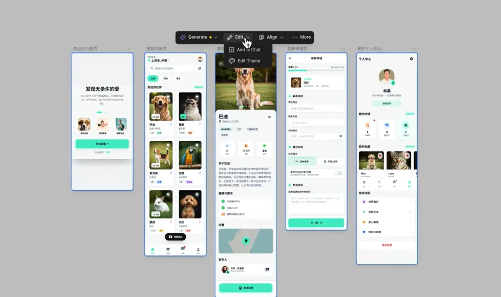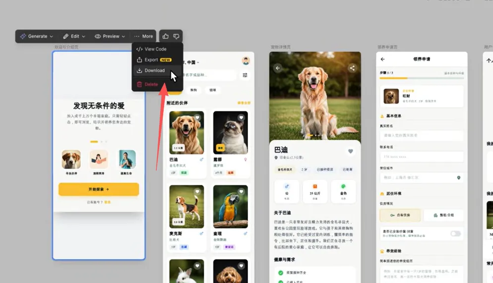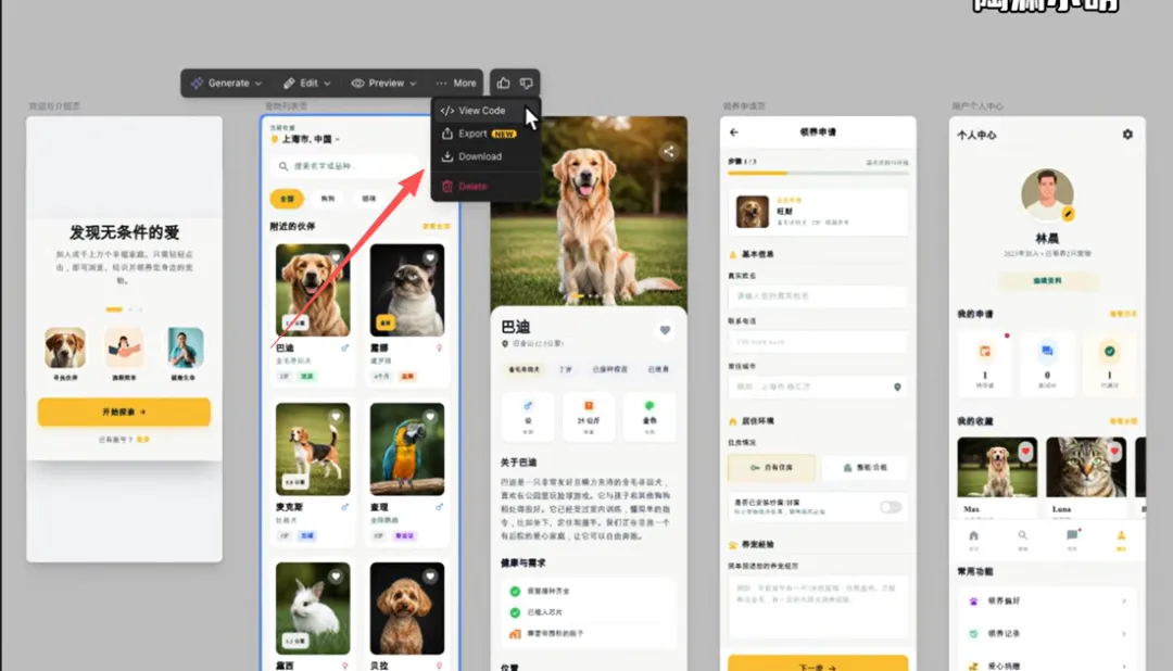 那执行结束以后,那可以看到这里给我们生成了5个UI页面,分别对应的是欢迎介绍页面、宠物列表页面、宠物详情页面、领养申请页面,还有个人信息中心,而且在里面还填充了一些默认数据。