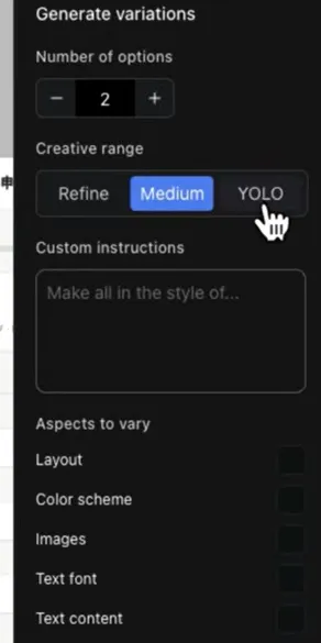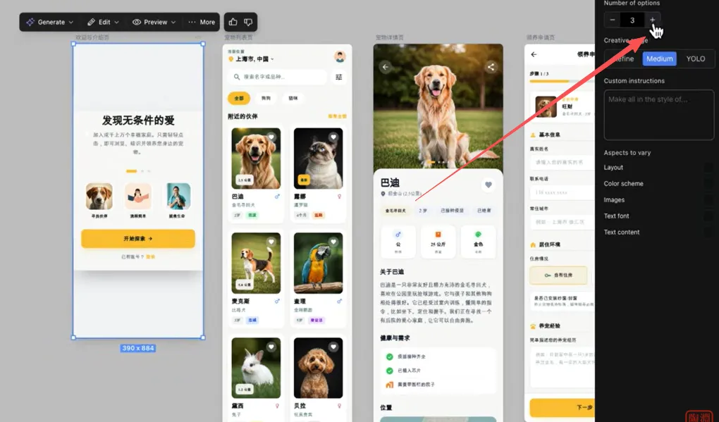 那在这个generate这个下面有一个variations,那它可以用来生成这个UI的变体,也就是根据现有的这个UI重新生成不同的设计。