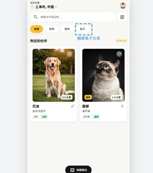 删除了这个兔子分类,还有这个地图模式,而且这个地理位置现在只显示城市。那在经过几轮测试和修改确认没问题以后,我们这个前端app就可以用来进行下一步操作了。