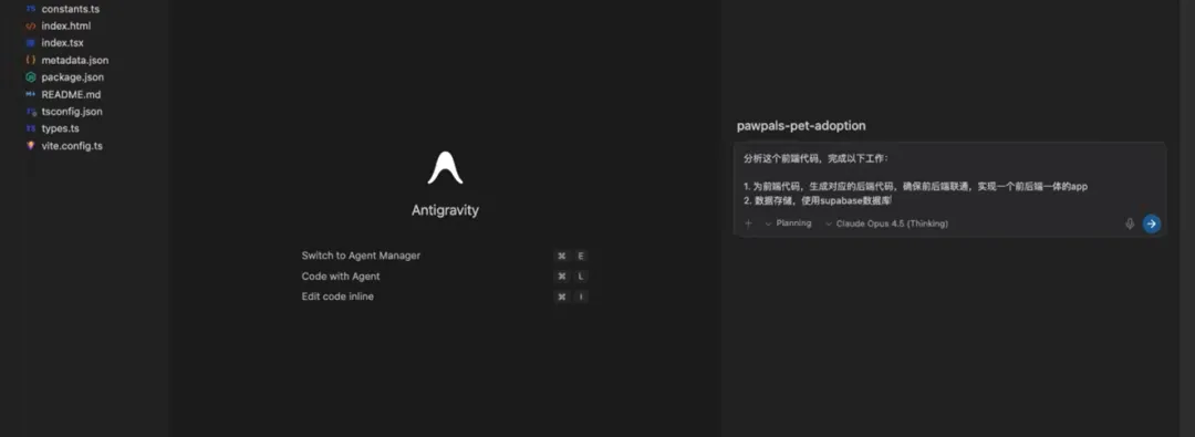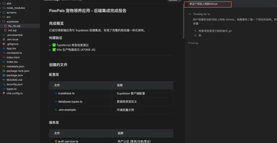 我们先把这个前端代码导入进去,然后我们让IT gravity分析这个前端代码,并为它生成对应的后端代码,实现一个前后端一体的这样一个完整的app而且这个数据存储要求使用在线的super base数据库点击执行。