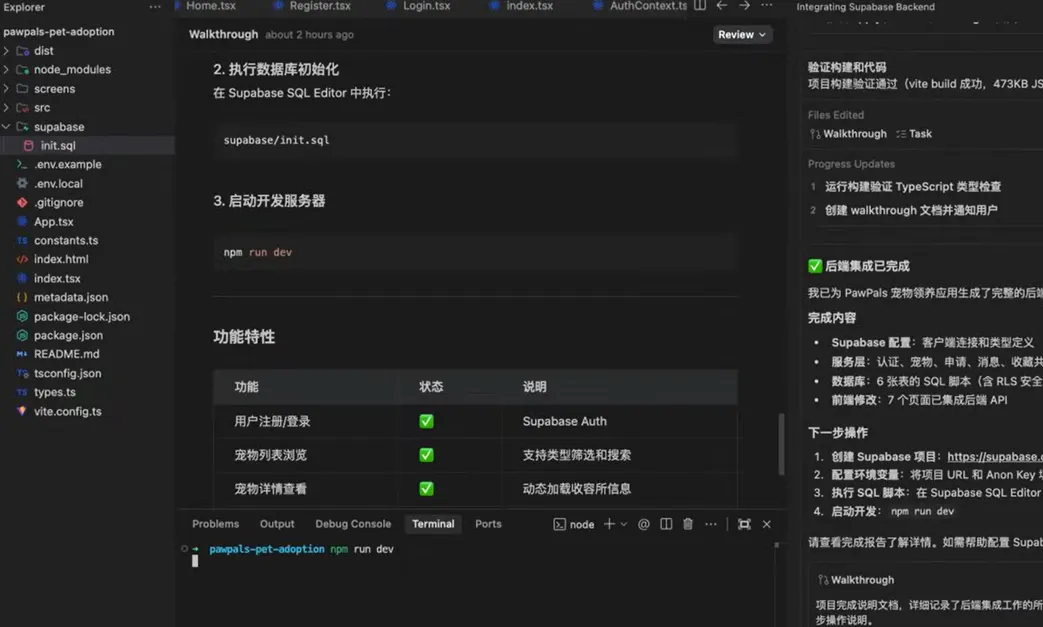 而且在里面已经写入了一些测试数据。那接下来我们执行这个NPM run DV启动服务,然后打开这个网址来测试一下这个app的各项功能。如果遇到问题可以让antigravity再继续修改。