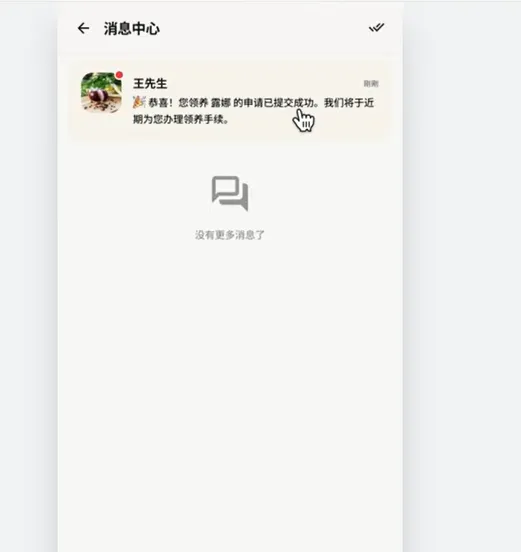 然后我们点击下面这个领养申请,填写这个领养的信息,然后勾选这个同意,点击提交领养申请。但在消息中心这里领养通过以后,会在这里给我们发消息通知。