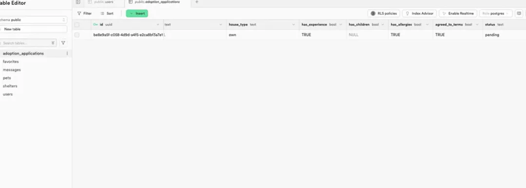 那申请的这个状态目前是pending,也就是等待审核。那这个message就是发送的这个消息通知,在个人中心这里显示,我们现在有一个领养申请正在审核中。