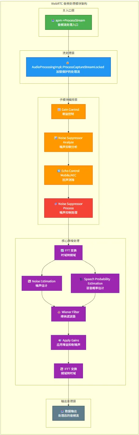 // 典型位置:WebRTC 音频处理链路(APM)里,通常在 AEC(回声消除) 前后之一执行: