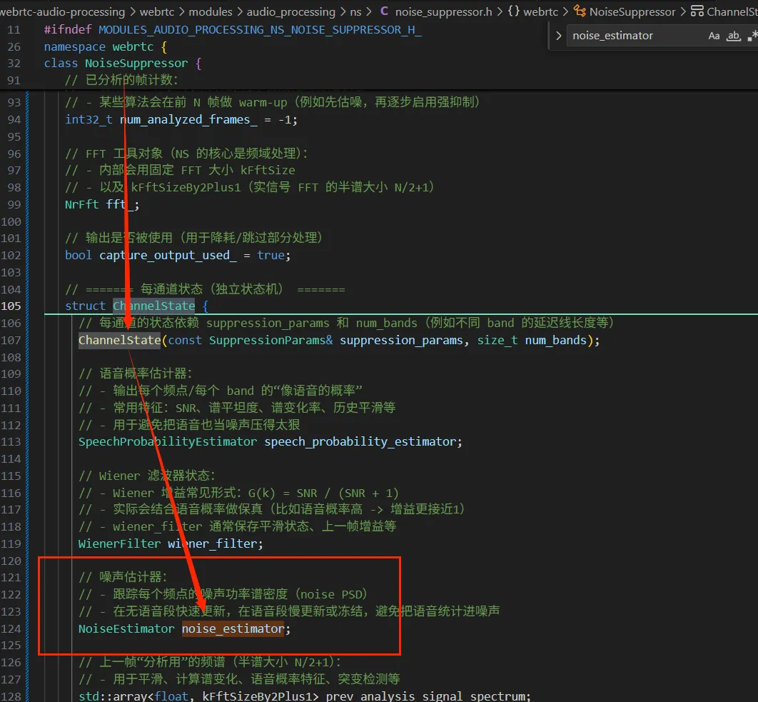 channels_[ch]->noise_estimator.PrepareAnalysis();这个是噪声估计器,对应在NoiseSuppressor里面的ChannelState里面: