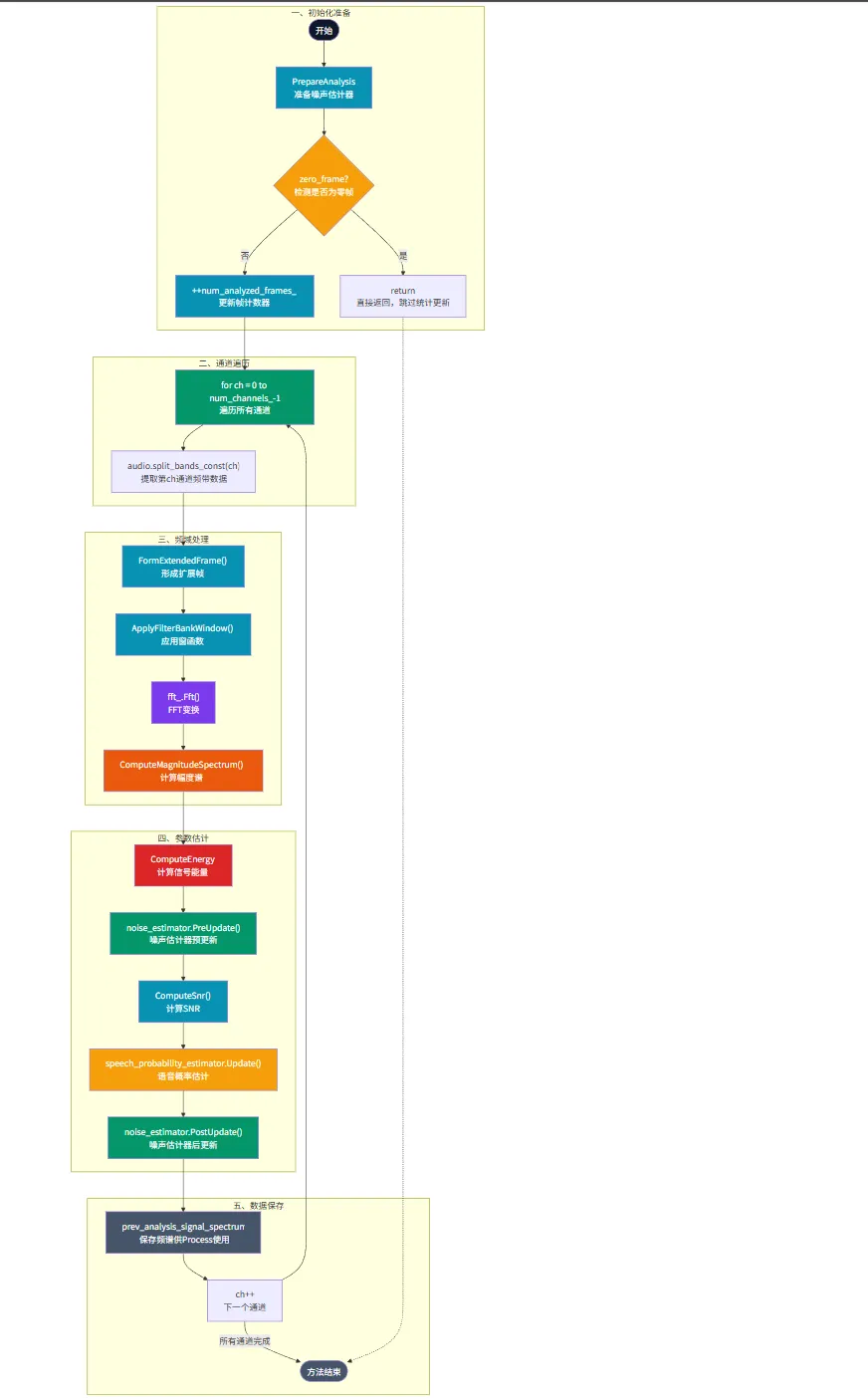 PrepareAnalysis() 的作用是把“上一帧噪声谱”保存下来,作为本帧噪声估计、SNR 计算和语音概率估计的历史参考,这是保证降噪算法稳定与平滑的关键一步。