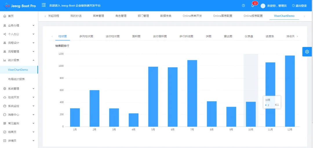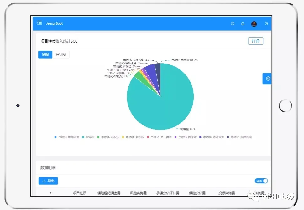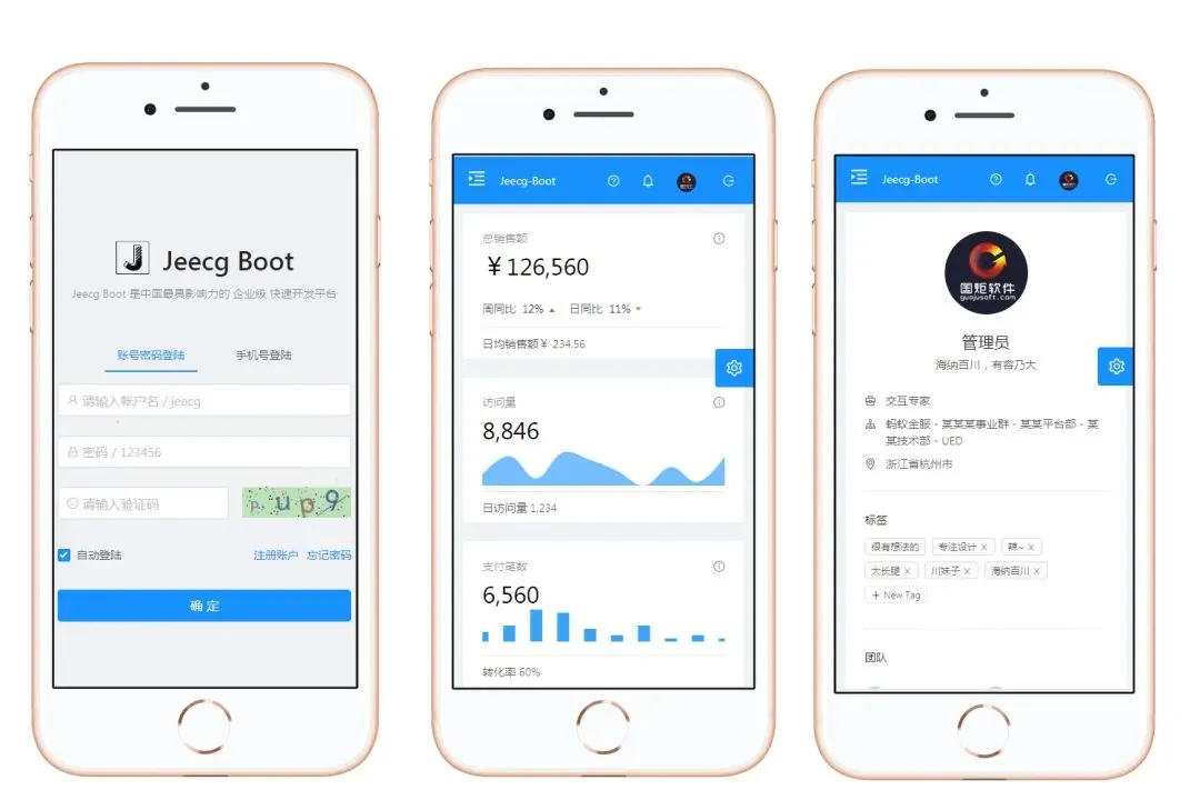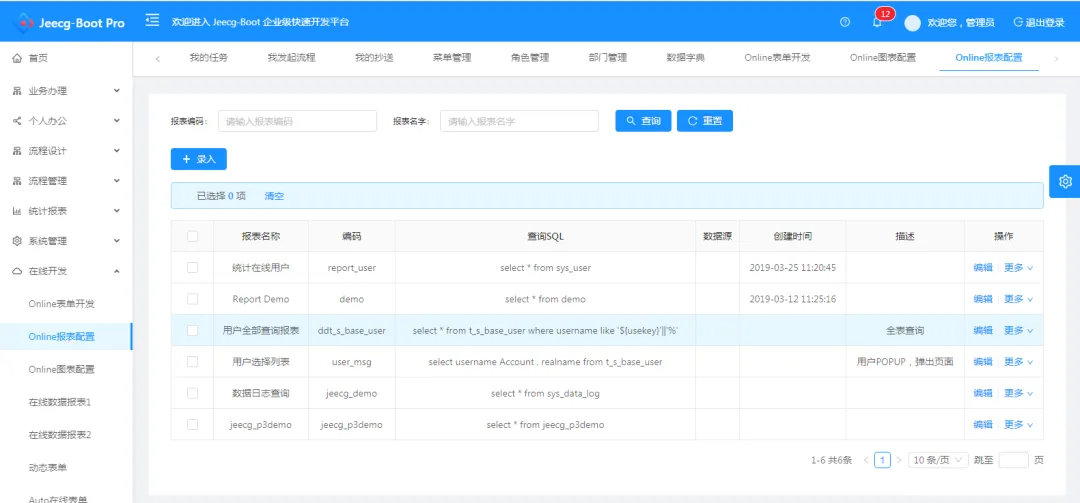 单服务、微服务部署 代码生成器 文件上传 数据报表 BRAC权限控制 CAS单点登陆 第三方登陆 生成小程序 Excel支持 支持SAAS多租户 短信配置 ... 系统截图