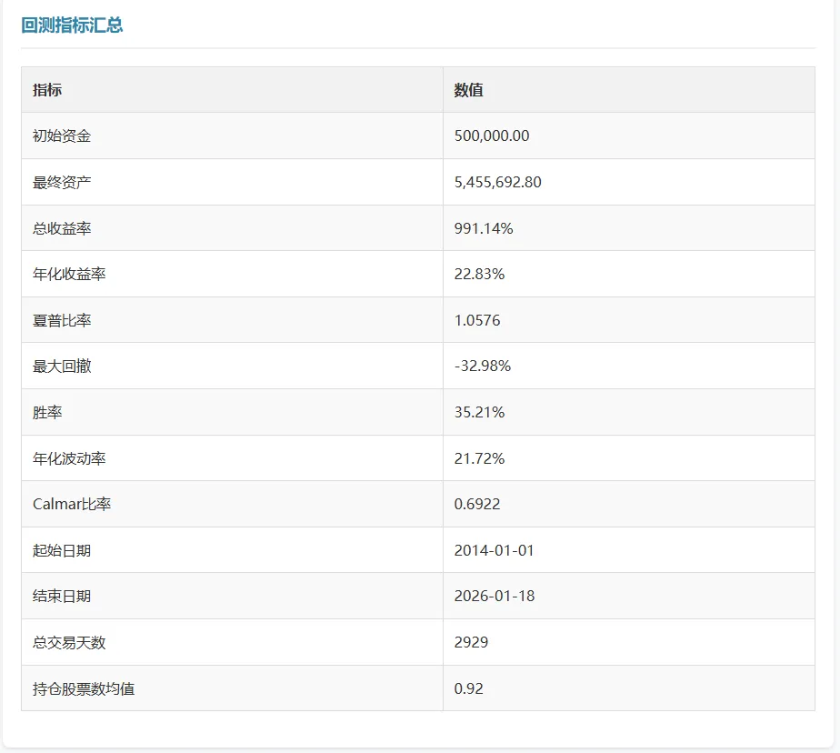 def _select_stocks(self, prev_date, current_date):# prev_date : datetime 前一日日期# current_date : datetime 当日日期(用于检查可交易性)candidate_stocks = []for stock_code, df in self.data.items():prev_row = df.loc[prev_date]current_row = df.loc[current_date]# 获取指标rsrs_score = prev_row.get('rsrs_std_score')r2 = prev_row.get('rsrs_r2')momentum = prev_row.get('mon20')current_open = current_row.get('open')# 检查条件:指标有效、RSRS标准分大于买入阈值、R²大于0.2if (pd.notna(rsrs_score) and pd.notna(r2) and pd.notna(momentum) and pd.notna(current_open)):if (rsrs_score > self.buy_threshold and r2 > 0.2):# 计算综合得分:动量 × R²composite_score = momentum * r2candidate_stocks.append((stock_code, composite_score))# 按综合得分排序(降序)candidate_stocks.sort(key=lambda x: x[1], reverse=True)# 返回前self.stock_num个selected_stocks = [stock_code for stock_code, score in candidate_stocks[:self.stock_num]]return selected_stocks