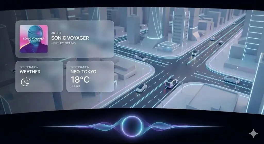 画面描述:一张极具未来感的座舱 UI 设计图。背景是干净的 3D 地图,左侧悬浮着 2 张半透明的卡片(一个是正在播放的音乐,一个是即将到达的目的地天气),底部没有 Dock 栏,只有简洁的语音光环。