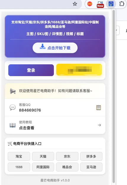 星芒电商助手是一款免费使用的电脑浏览器插件,主要功能是可以提取下载1688、淘宝、京东等多个电商平台的主图、SKU图、视频、详情图、买家秀等素材。是电商运营人员非常实用的提效工具。直接点击下图”开始下载按钮“即可提取,非常简单,如下为工具截图: