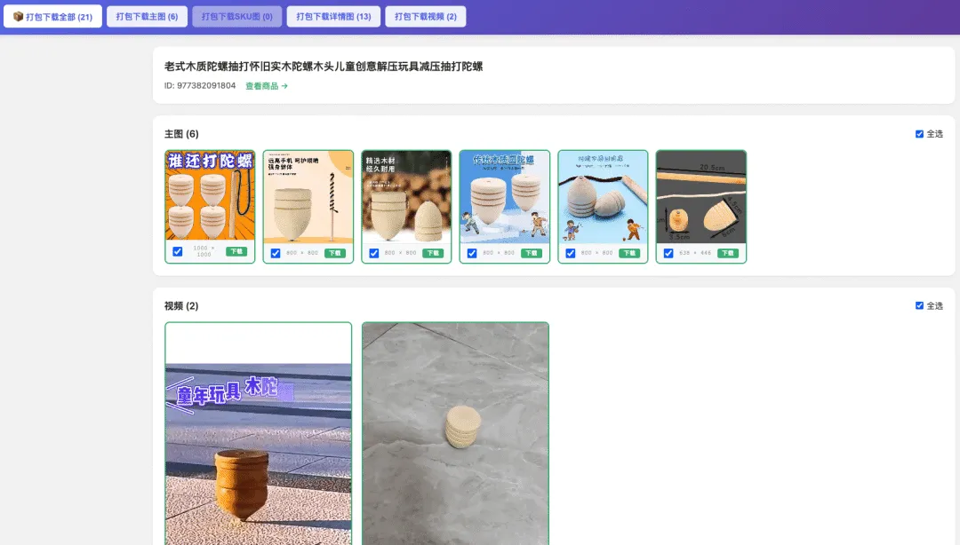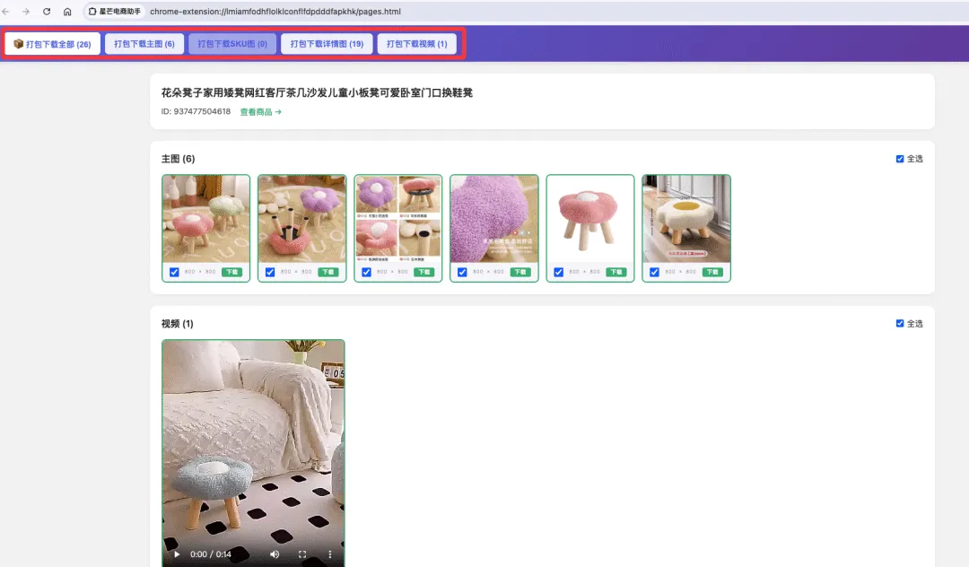 2. 提取结果如下图,点击对应的按钮就可以选择下载主图、SKU图、详情图或者视频了: